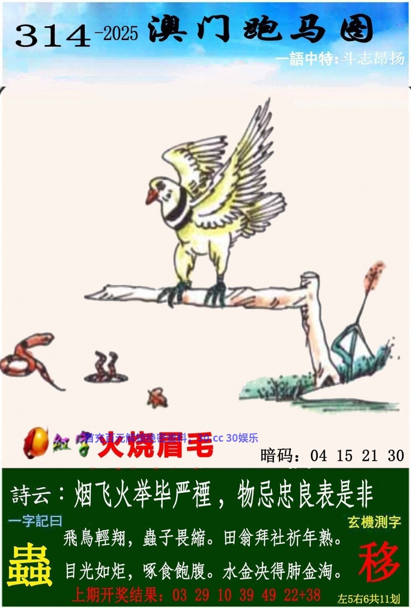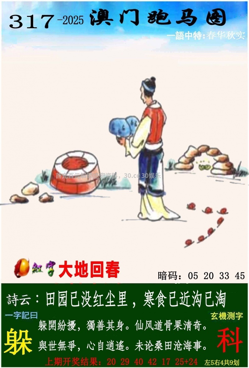 | 317期一字記曰:【躲】 解:图片显示一个男子站在井边解出水肖鼠猪,本期红字带来的是大地回春的意思是指冬去春来时草木萌发、大地复苏的自然景象诗词的意思是躲开纷扰:在纷繁复杂的世界中,能够保持清醒与冷静,不为外界干扰所动。独善其身:专注于自我成长与提升,不为他人所干扰,也不妨碍他人。仙风道骨:拥有高尚的品格与坚定的信念,能够在世事中彰显风骨 综合取肖:鼠猪马牛猴兔龙 |