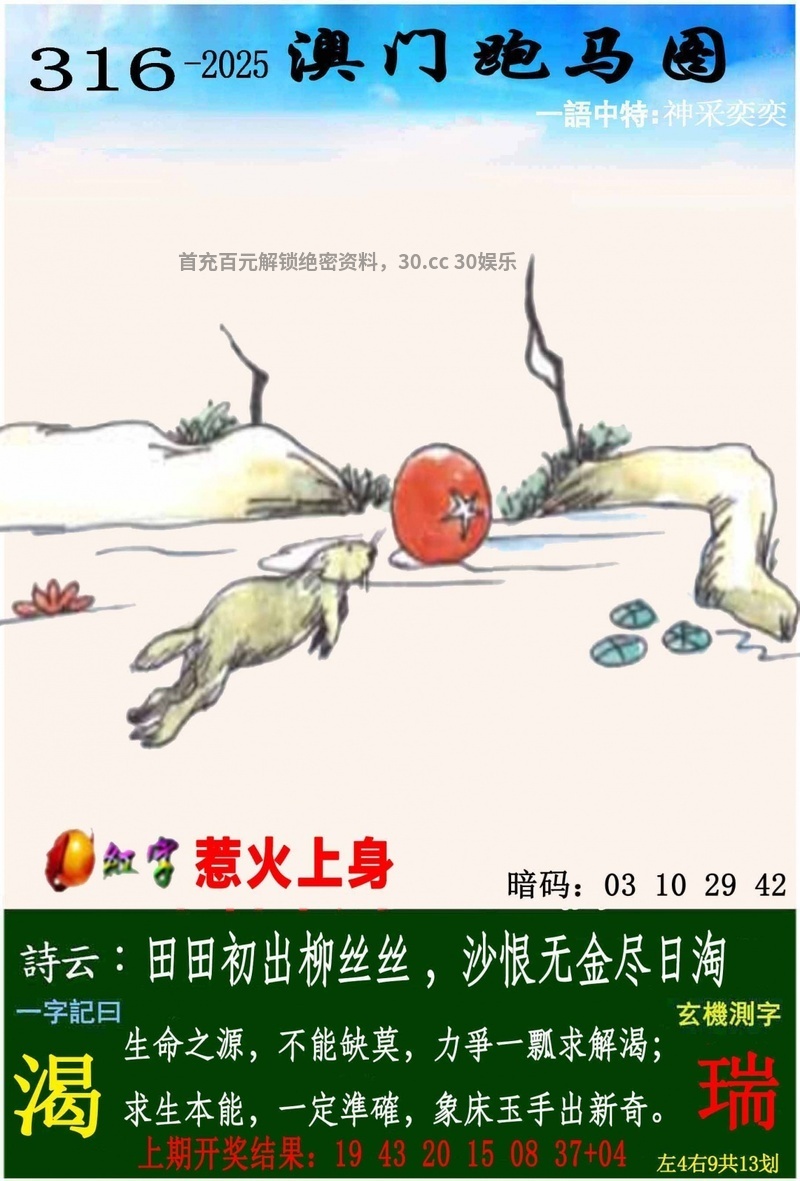 | 316期一字記曰:【渴】 解:图片显示一个兔子面前有一个红球解出明肖兔,红球解出红波的特码,本期红字带来的是惹火上身的意思是比喻因自身行为主动招致灾祸或麻烦,最终使自身受害,具有贬义色彩诗词的意思是若莫指代水,则不能缺莫可理解为水不可缺失,呼应水对生命存续的必要性。部分非权威资料将其与生肖鼠关联,认为其象征生存智慧(如精准获取资源),但此解释缺乏科学依据 综合取肖:兔蛇马龙羊猴鼠 |