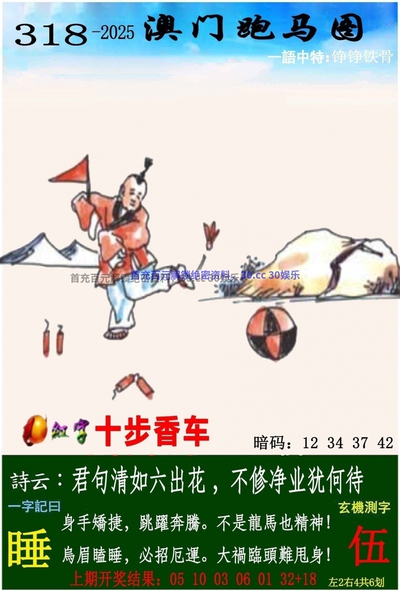| 318期一字記曰:【睡】 解:图片显示一个小孩在踢毽子解出小数01-24.本期红字带来的是十步香车的意思是比喻处处都有人才,通过十步与香车的意象组合,暗含人才分布密集之意诗词的意思是大祸临头难甩身这一现象,又与龙马的运势密切相关,龙马是大水的象征,象征着大逆不反、大灾大祸,但也意味着好运连连。大祸临头难甩身并不是一种不可避免的厄运,而是一种需要耐心等待好运的运势 综合取肖:鸡猪牛狗虎鼠猴 |